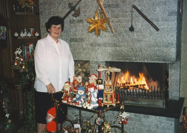 Weihnachten 2000; Karin mit ihrem geschmückten Teewagen vor dem Kamin